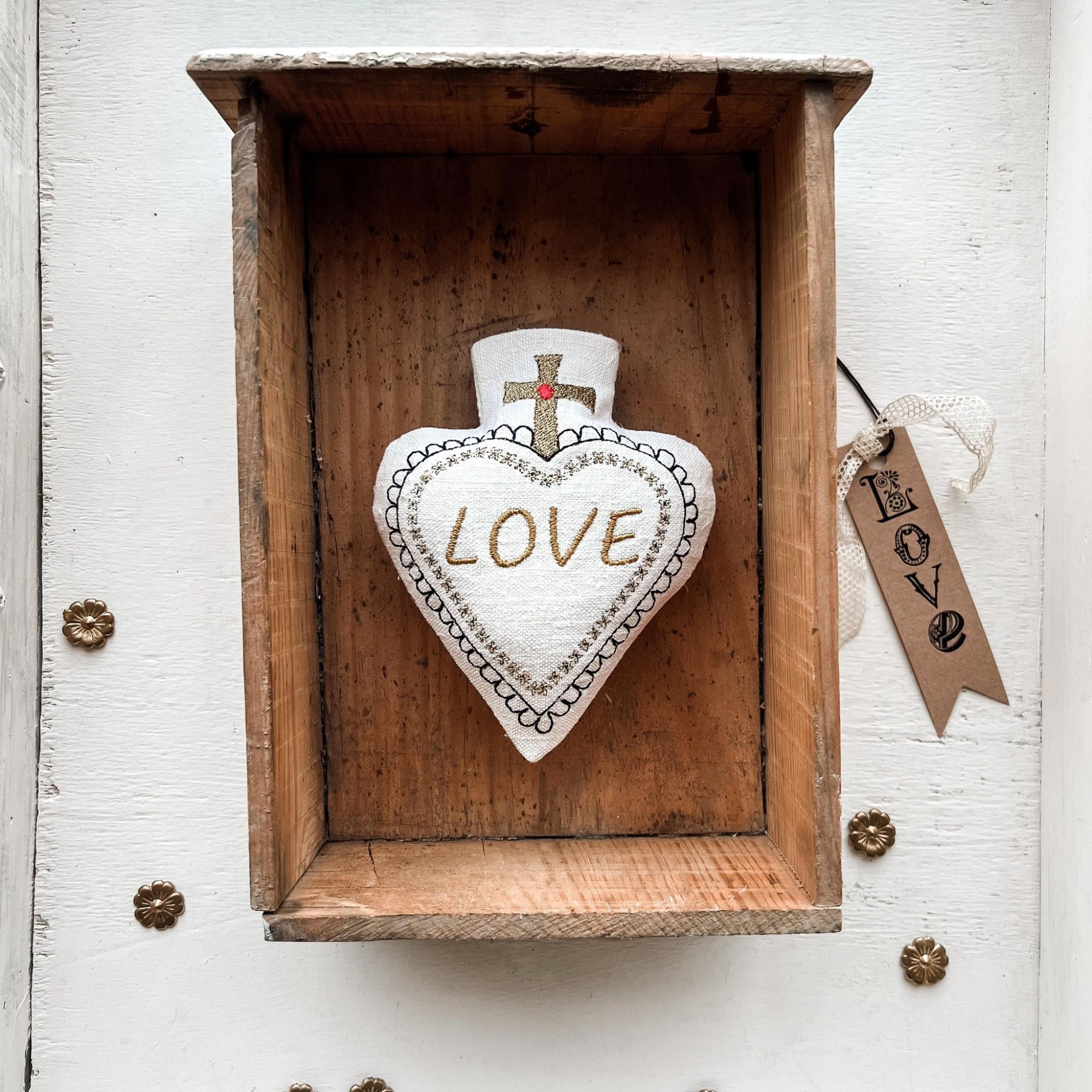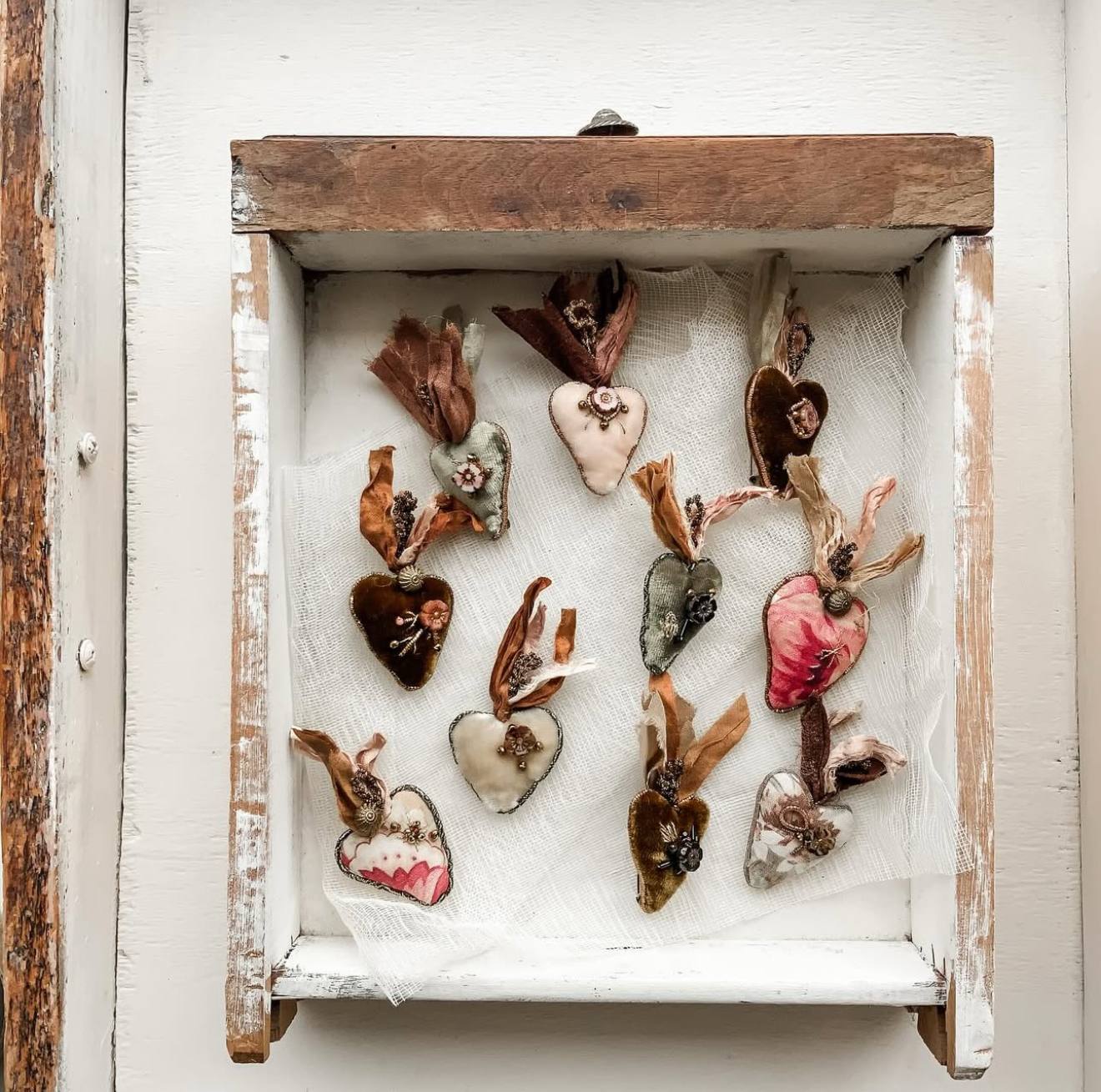 J’utilise des textiles anciens et contemporains, des étoffes chinées et des objets de brocante que j’associe à mes dessins brodés. Chaque pièce raconte une histoire, entre héritage et douceur intemporelle.